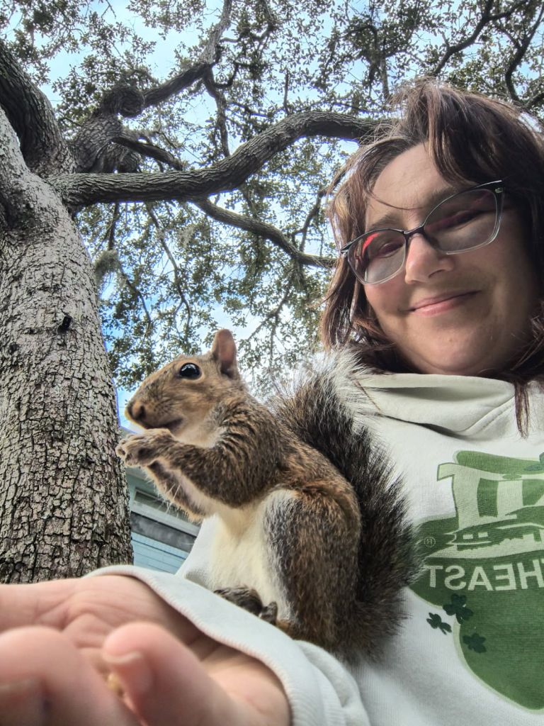 The main reason for our longer stop was to visit my cousin Jessica, and we had such a great time catching up! We got to see her beautiful new house and spend some time with her husband too. And best of all, I got to meet the baby squirrel 🐿️ she rescued! He’s living outside now but still comes by for visits, and I was so lucky to be there when he stopped in for some treats.